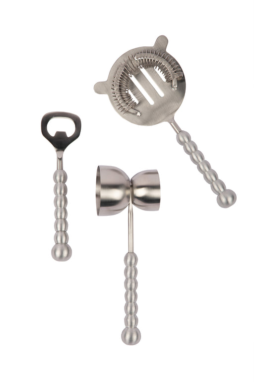 The RoseBuck Sphere Bar Set features three everyday essentials: a strainer, bottle opener, and jigger. Finished in brushed stainless steel with scu...